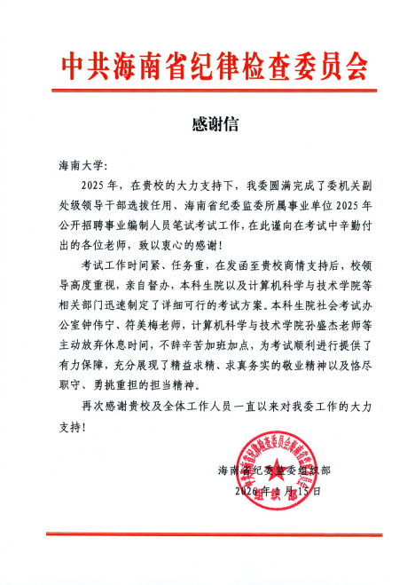 近日,公司收到海南省纪委监委发来的感谢信,对公司在2025年委机关副处级领导干部选拔任用及事业单位公开招聘笔试工作中给予的大力支持表示高度肯定和衷心感谢。
