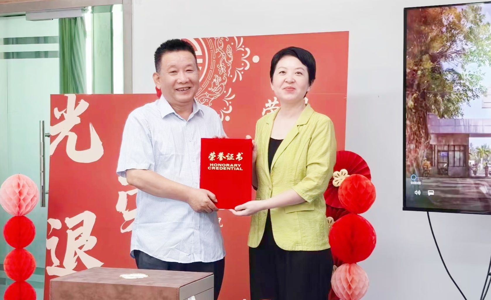 王红英为孙盛杰老师颁发荣退证书。